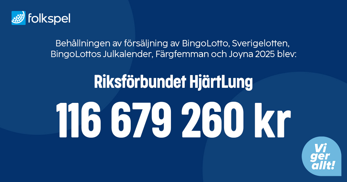 2 215 389 kr. Så mycket har Folkspel betalat ut till Riksförbundet Hjärtlung senaste året. Totalt har föreningslivet tjänat hela 372 miljoner kronor på att sälja Folkspels lotter under året. Och mest av alla organisationer har vi i Riksförbundet HjärtLung tjänat.