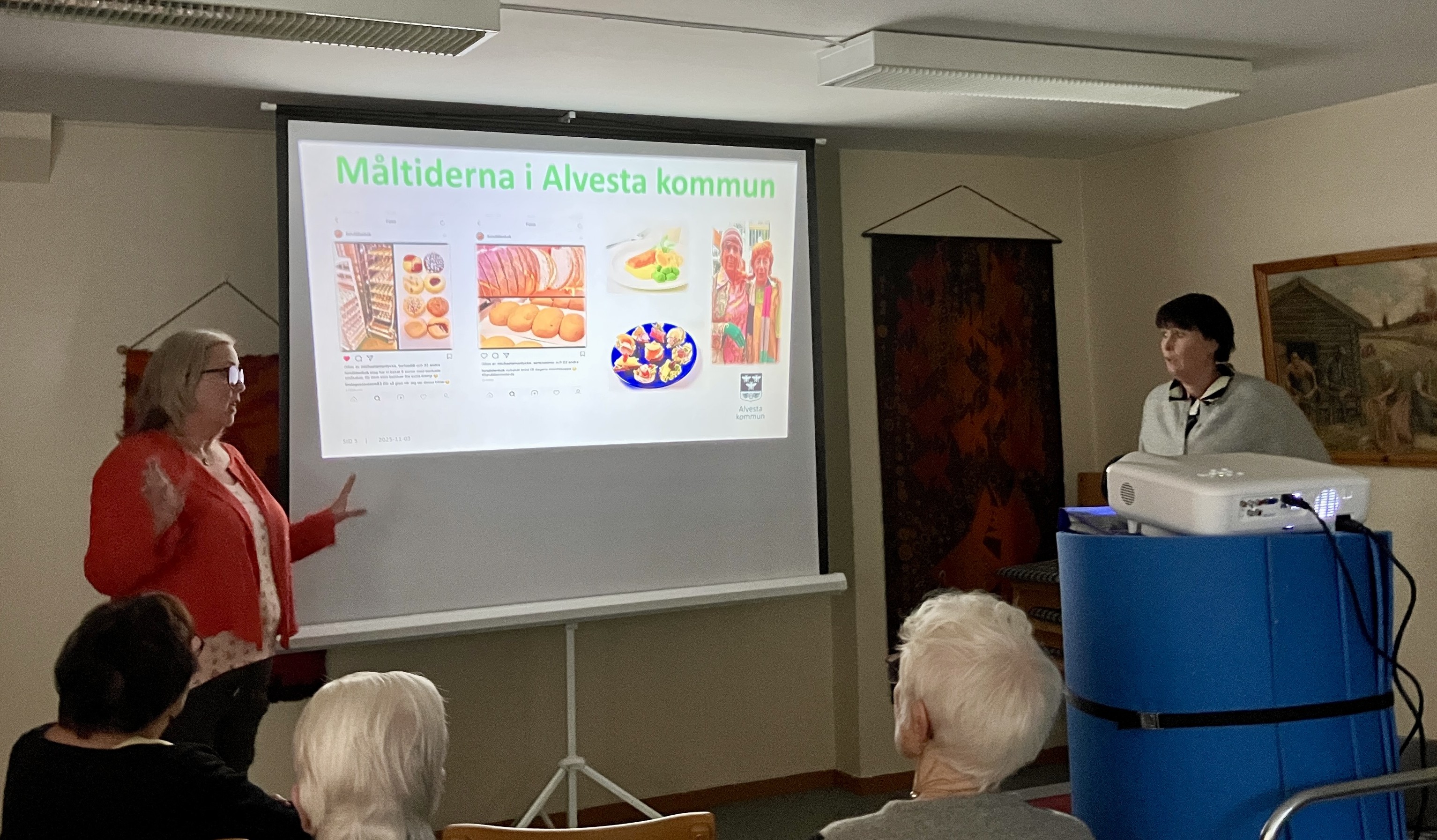 På måndagsträffen 3/11 fick vi information om omsorgens måltider inom Alvesta kommun. Kommunens måltidschef Linda Gustavsson och förstekocken Anette Svahnberg från Björkliden i Vislanda berättade hur organisationen fungerar för alla måltider som serveras på på särskilda boenden och för dem som har levererade måltider i hemmet. De berättar också hur viktigt det är att ha det mysigt och fint runtomkring sin måltid.