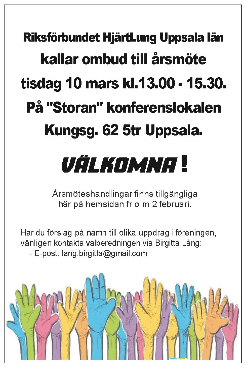 Riksförbundet, Länsföreningen i Uppsala med sina fyra Lokalföreningar arbetar alla för att personer med hjärt-, kärl- och lungsjukdomar ska kunna leva ett bra, rikt och friskare liv. Genom